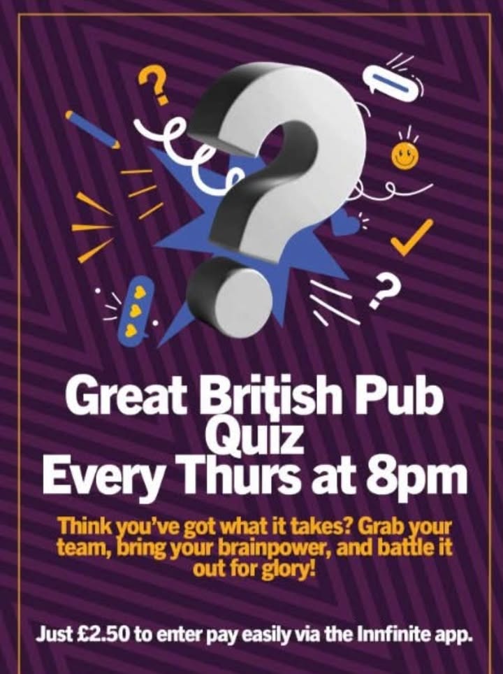 Think youβre the brains of Britain? π§ Join us tomorrow night for the Greatest British Pub Quiz! Just Β£2.50pp to enter, and this weekβs jackpot is a whopping Β£900+ π°. Donβt miss it. Entries need to be in for 7:45.